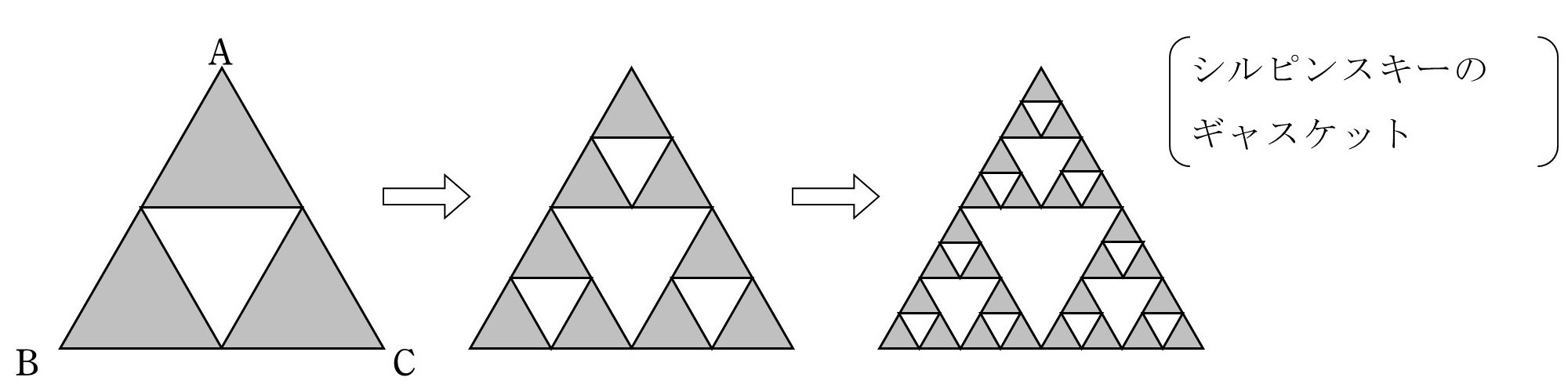 右図のように,二等辺三角形 \(\rm{ABC}\) から順に正三角形を \(1個,2個,2^2個,2^3個, \cdots \) を取り除いてできるコッホ曲線は,